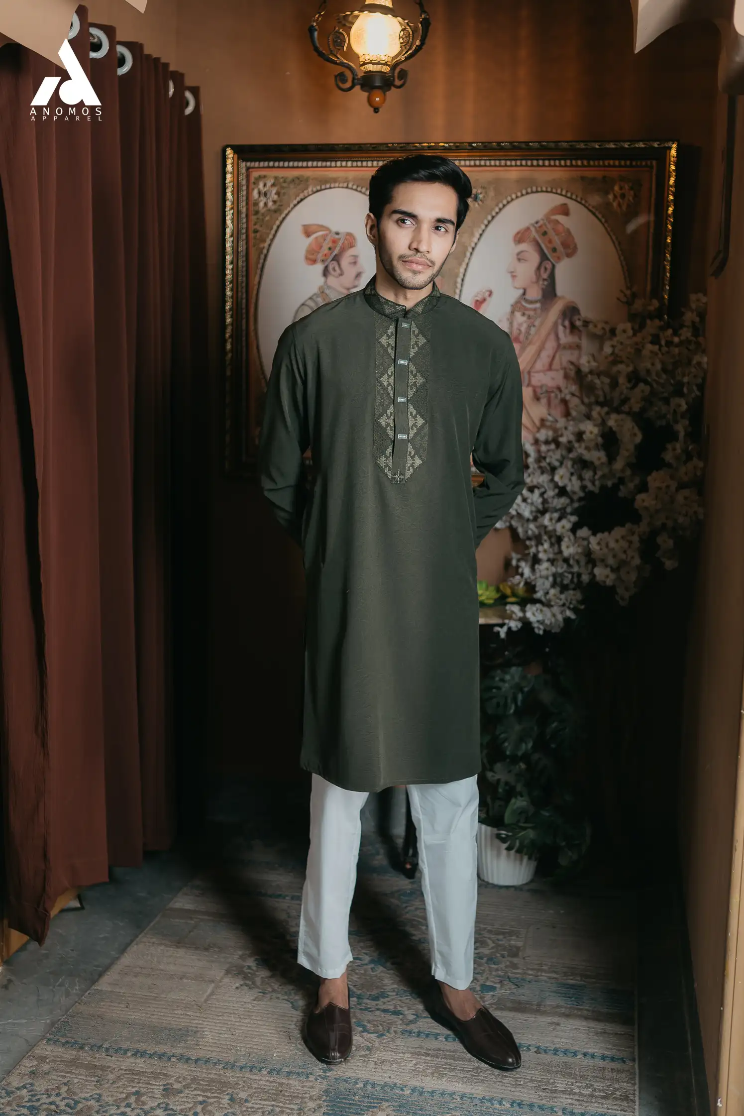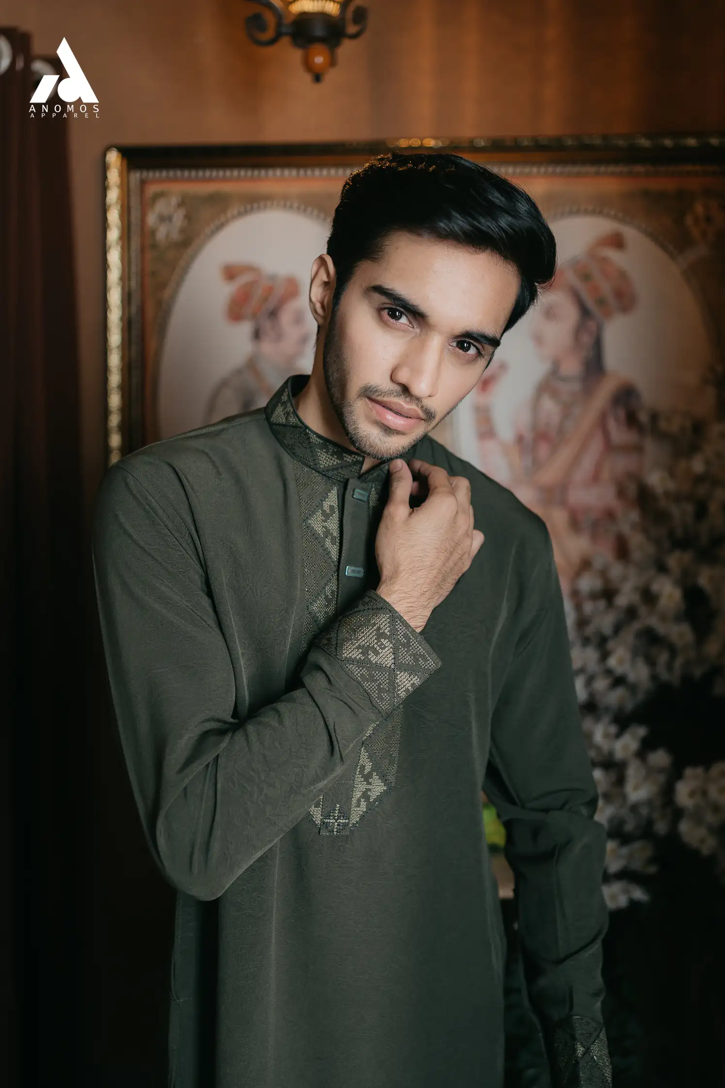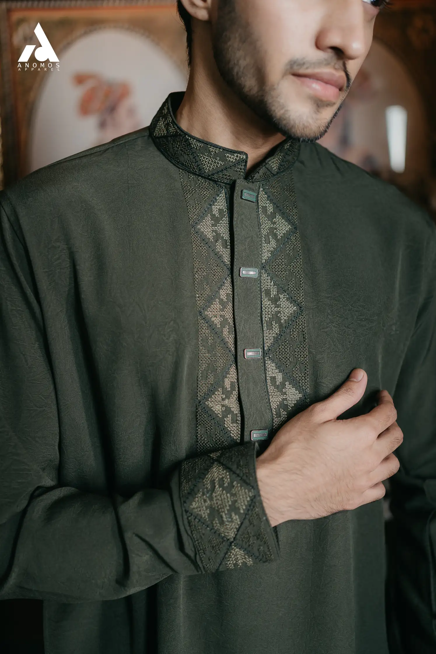 Luxury Texture Fabric Embroidery Panjabi – Dark Olive